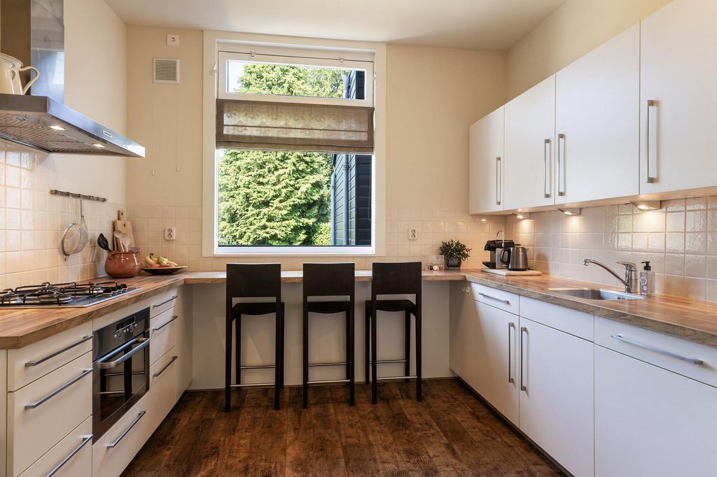 The 617m² plot is beautifully landscaped with a low maintenance garden surrounding the villa. High hedges and lush planting ensure privacy. Due to the position of the garden, there are sunny spots throughout the day, perfect for relaxing outdoors. The front garden has several majestic trees, shrubs and bushes that add to the stately character of the villa. The driveway off the Kerklaan provides off road parking for two cars and leads to the detached garage with two additional storage rooms and a canopy for bicycles or containers.To experience and see