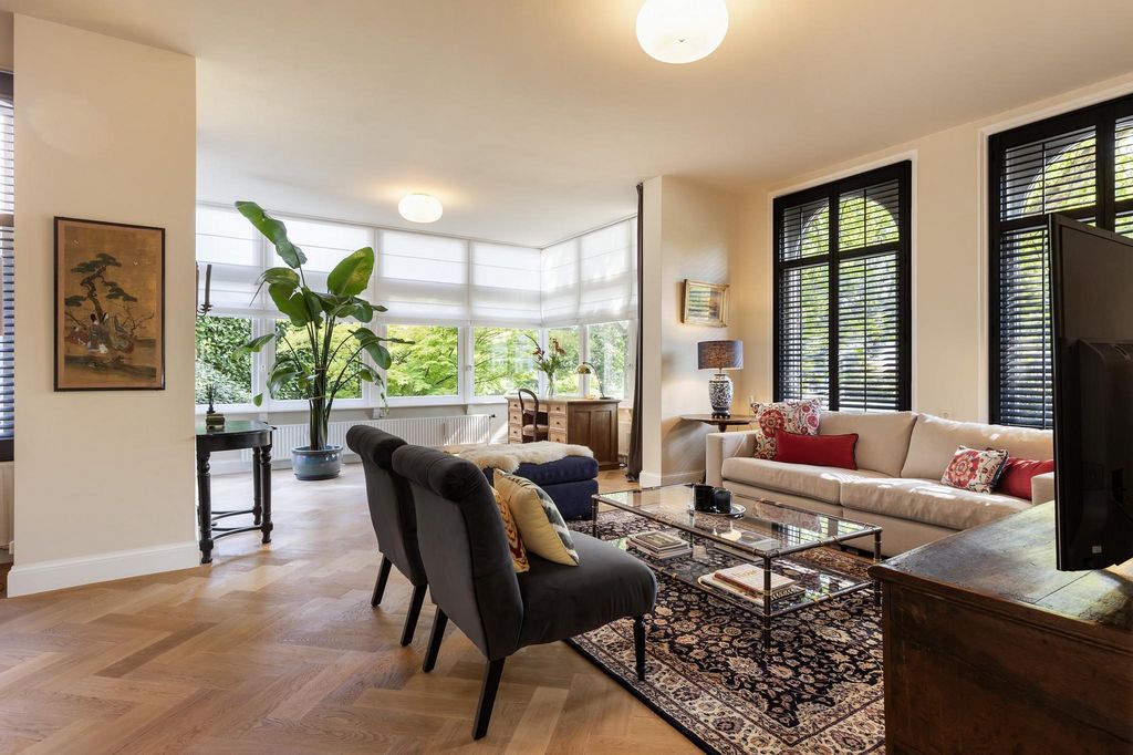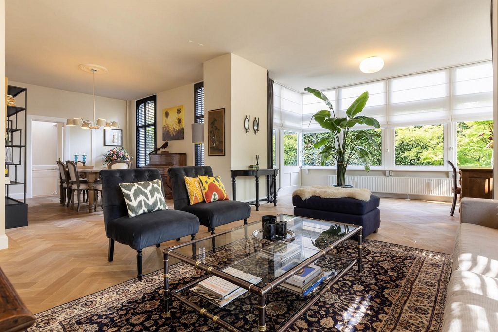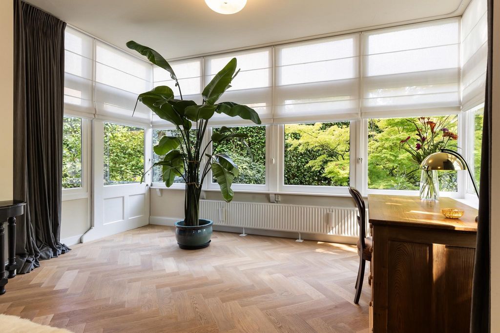 The special blend of historic charm, contemporary comfort and unique architecture makes this villa a special home that must be seen to truly experience its space and atmosphere. The warm living spaces, carefully preserved period features and modern amenities combine to create a unique living experience. You are more than welcome to visit and experience for yourself what makes this city villa so special. Esta exclusiva villa urbana independiente de cuatro plantas, que incluye un entresuelo, combina una elegante historia monumental con espacios habitables atmosféricos y confort contemporáneo. Situada en una hermosa esquina de la Kerklaan y el Sr. van Rhemenslaan, la villa también tiene vistas al Oranjepark. El diseño único de la villa permite que se utilice de diversas maneras, desde una espaciosa casa familiar hasta una oficina en casa. Estilo e historia