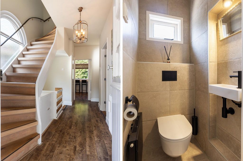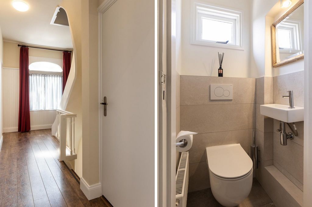 A la majestuosa entrada a la villa se llega a través de la amplia escalera y los impresionantes escalones. El pasillo conduce a la sala de estar, un aseo moderno y una escalera de roble al primer piso. El amplio salón, a la derecha del recibidor, rezuma ambiente y elegancia. Techos altos y ornamentales, detalles bellamente restaurados y grandes ventanales arqueados inundan la habitación de luz. La acogedora sala de estar invita a relajarse, mientras que el soleado invernadero con puertas francesas al jardín es un lugar encantador para disfrutar del sol de la mañana. Las persianas negras de buen gusto en las ventanas altas le permiten controlar la luz como desee, creando un ambiente íntimo y cálido. Más allá del pasillo se encuentra la espaciosa cocina / comedor con un diseño blanco en forma de U. La cocina está equipada con electrodomésticos integrados; Placa de gas, campana extractora, lavavajillas, nevera, congelador y microondas. La barra de desayuno conecta las dos cocinas y tiene vistas al jardín trasero.