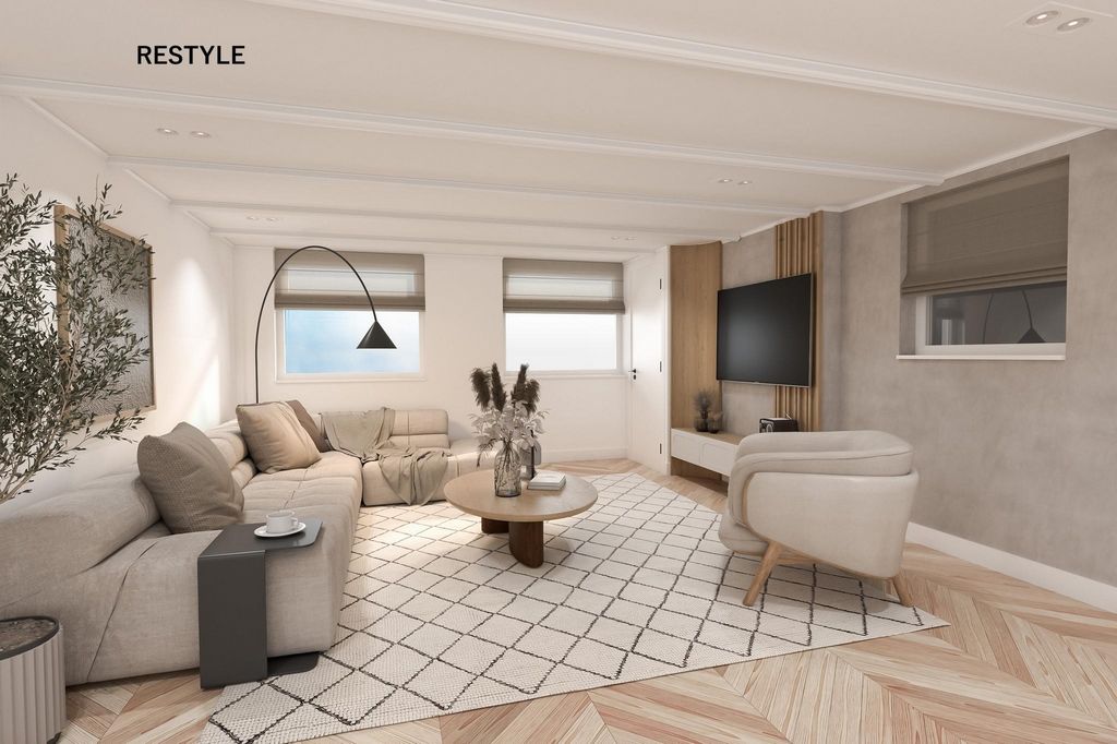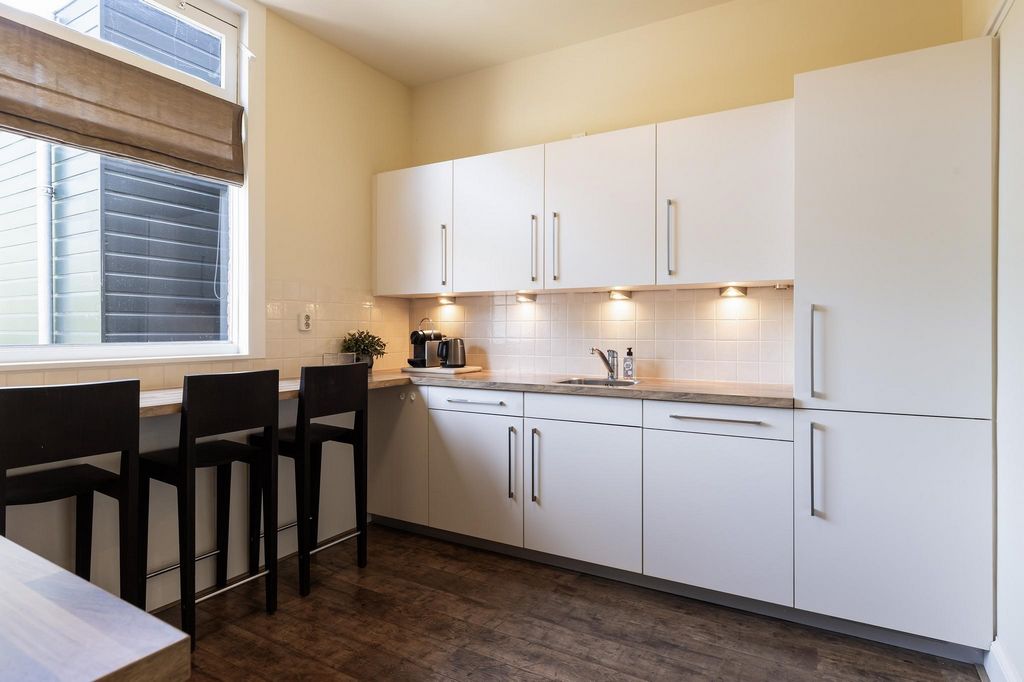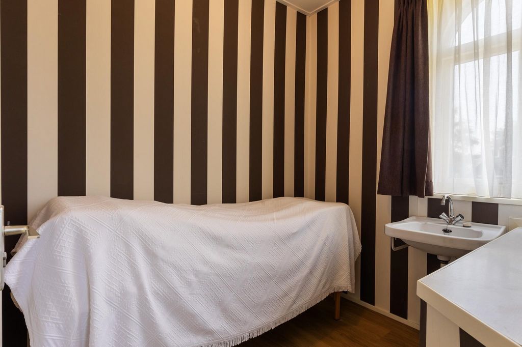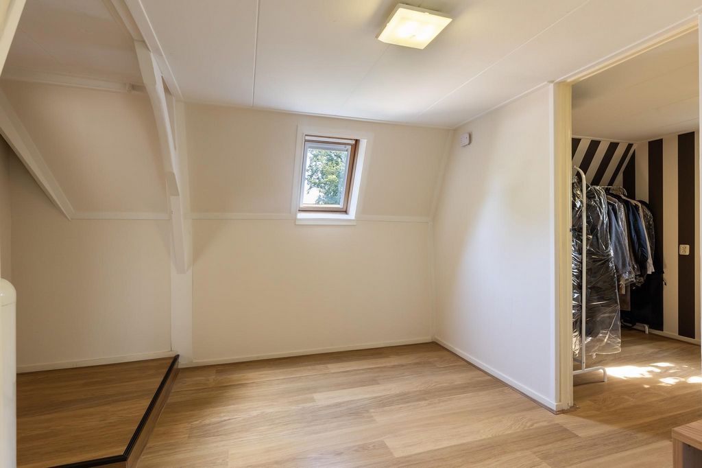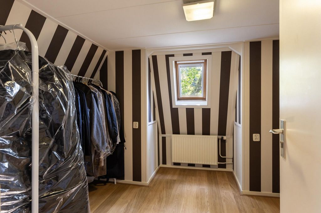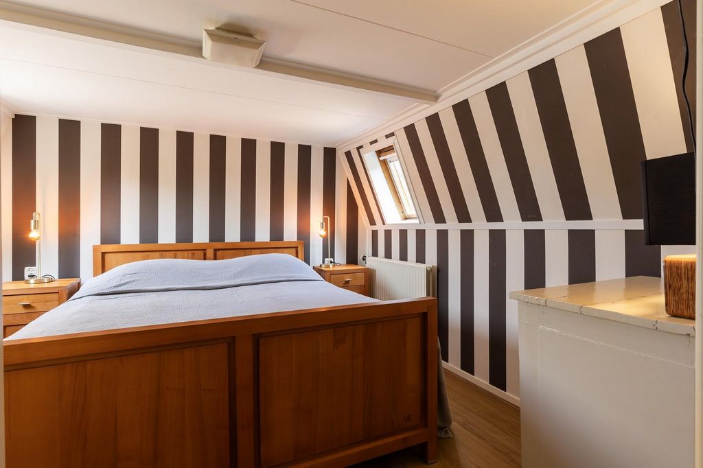 Na pierwszym piętrze podest prowadzi do dwóch przestronnych sypialni i luksusowej łazienki. Duża główna sypialnia z przodu jest oazą spokoju i ma drzwi prowadzące na przestronny taras na dachu z pięknym widokiem na Oranjepark. W drugiej sypialni, z miejscem na podwójne łóżko i dużą szafę, panuje przytulna atmosfera z dużą ilością światła. Luksusowa łazienka została niedawno odnowiona i wyposażona jest w kabinę prysznicową, podwójną umywalkę, duże lustro z oświetleniem, wiszącą toaletę i bidet. Nowoczesne 3. toaleta na podeście uzupełnia to piętro. Stałe schody prowadzą na drugie piętro, gdzie znajdują się trzy kolejne sypialnie. Do jednego z nich można wstawić pojedyncze łóżko. Pozostałe sypialnie są przestronne i oferują wystarczająco dużo miejsca na podwójne łóżko, a niskie sufity i urocze okna przyczyniają się do cichej i komfortowej atmosfery. Piwnica i wielofunkcyjne zastosowanie