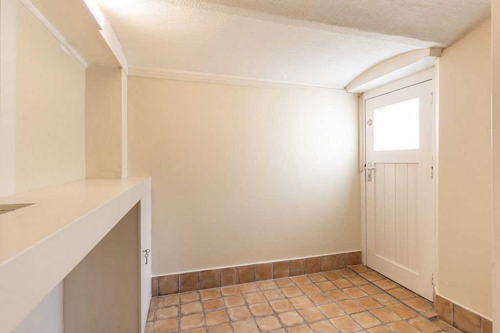 Das Untergeschoss wird über eine Treppe von der zentralen Halle aus erschlossen und verfügt über einen eigenen Eingang von außen. Ein geräumiger Empfangsraum mit originalen Bodenfliesen und ein funktionaler Küchenbereich mit einfacher Speisekammer und Sanitäranlagen für die Wäsche bieten zusätzlichen Komfort. Die beiden großen Räume, die früher als Büros genutzt wurden, eignen sich ideal für kreative Nutzungen wie Heimkino, Lounge oder Hobbyraum. Die intime Atmosphäre dieser Räume macht sie auch ideal für Gästezimmer oder Home-Offices. Arden und Außenbereich