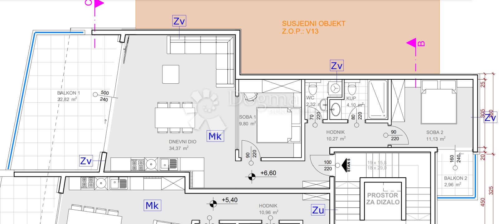 Stan se nalazi na drugom katu i ukupne je površine 84.88 m2. Sadrži dvije spavaće sobe, jednu kupaonicu i WC. Dnevna cjelina ima kuhinju, blagovaonicu i dnevni boravak.Jedna spavaća soba ima i manji balkon.