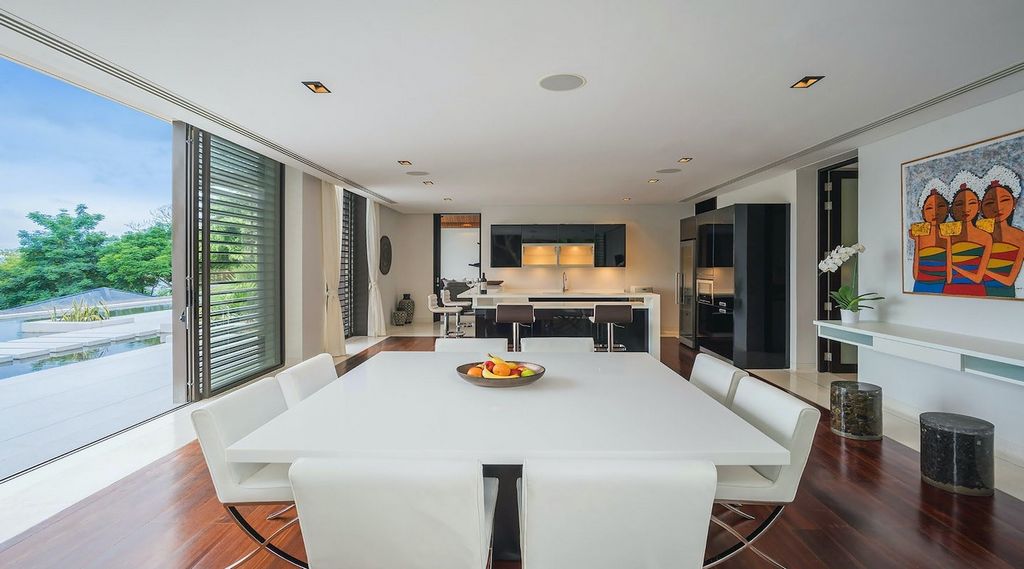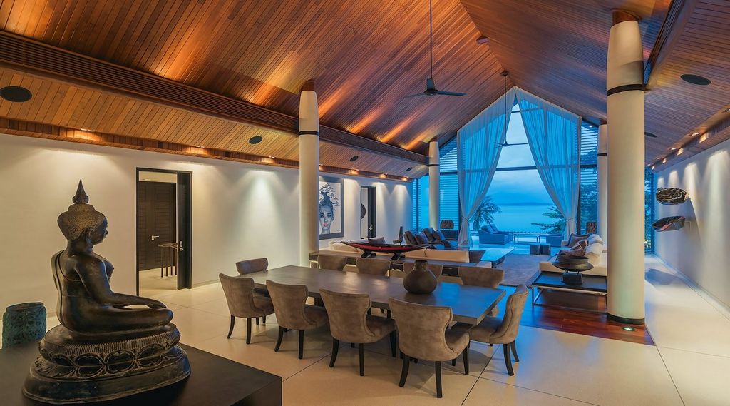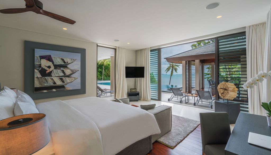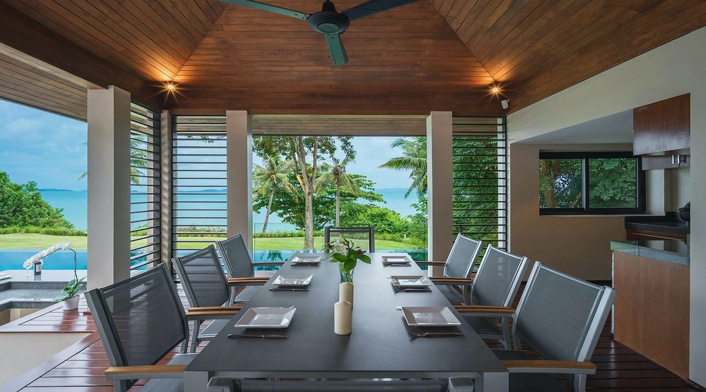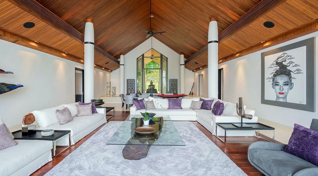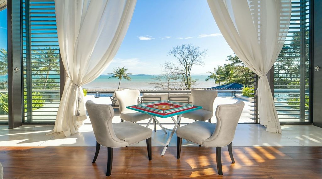- Washing Machine View more View less Located in the exclusive award-winning Cape Yamu Estate, this stunningly designed villa occupies a prime area of waterfront land on the exclusive and quiet, Northeast coast of Phuket. This luxurious, 4-bedroom, 5-bathroom, plus 3-powder room multi-level masterpiece is the product of world-renowned architectural design team Philippe Starck and Jean-Michel Gathy. This villa enjoys unparalleled views of Phang Nga Bay, a naturally preserved region with its rolling emerald hills blanketed by lush tropical landscape, tall coconut groves, and fast access from nearby marinas to beautiful islands with pristine beaches and dramatic limestone cliffs. The property is just 20-minutes from Phuket International Airport, and nearby four full-service marinas with two boating piers. It is nestled in a quiet gated community and owners enjoy access to the nearby award-winning five-star COMO Point Yamu Resort, with its state-of-the-art sports and wellness facilities and superb dining options. For nature lovers, the Khao Phra Thaeo National Park with Gibbon Rehabilitation Centre and eye-catching Bang Pae waterfall are within close reach. The beautiful beaches of BangTao and the bustling streets of Patong and Phuket Town are a mere 30-minute drive away. This palatial haven tastefully blends contemporary Thai design with modern grandeur, featuring spacious open-plan indoor/outdoor living areas, opulent interiors, verandas with sweeping sea views, comfortable ensuite bedrooms, and warm lighting to enhance serenity. The tiered verandas incorporate a reflective pond above a stylish 30-metre infinity lap pool with swim-up bar and adjacent alfresco dining area. The villa is brought to life each day with spectacular sunrises over the majestic cliffs in Phang Nga Bay, and sunset can be enjoyed from the private lawns and the beach. On arrival, enjoy the aromatic frangipani tree-lined lawns sweeping down to the grand entry sala and reflecting pool beside a large, covered carport with ample parking for up to 4 cars. The grand vaulted entrance with massive double doors opens to a living and dining pavilion that spills out onto a sea view, upper-level terrace overlooking the pool, lawn, and beach. The center of the villa features a pavilion of cathedral-like dimensions, where a vaulted wooden teak ceiling supported by spectacular white columns towers over terrazzo and rich teak floors. It is furnished with a sleek polished concrete dining table and a generous array of plush sofas and armchairs with soft area rugs. The space is stylishly accented with a soothing mix of hand-crafted and bronze Buddha sculptures and vibrant original artwork from Northern Thailand that balance with the contemporary furnishings. The villa is fully furnished with artwork, kitchen appliances and dining ware, bedroom linens, sports and gym equipment, paddle boards, and kayaks. Adjoining the pavilion on the right is the upper guest suite with pond and terrace access. Connected on the left is a fully equipped Western-style guest dining area which boasts a bar counter and stools, a wine fridge, kitchen/bar appliances, 50-inch wall-mounted screen with Apple and Pulse TV, and a chic dining table with white leather seating. This room opens onto the upper pond terrace with spectacular views of the bay. Adjacent is an additional fully equipped chef/maid’s kitchen, which includes a granite top island, also with bar seating. This further leads to the villa managers office, maid’s patio, bedrooms, bathroom, storage, and laundry. The outdoor living spaces at the villa include a furnished upper-level sun terrace with a reflective pond and unobstructed sea views and immediately below, a partially shaded pool deck with sofa seating, sun loungers, large double daybed and outdoor gym equipment. The 30-meter infinity lap pool features a shallow lounge shelf for relaxing or kids to swim, as well as a swim-up bar and integrated dining sala. Stretching beyond the pool is an immense flat, flexible, and open lawn with direct access to a peaceful beach for walks, boating and water sports. On the lower level is a very flexible arrangement currently presented as a primary suite, two neighboring guest suites and a media room/children’s bedroom. These lower-floor rooms enjoy direct access to the pool terrace with its alfresco dining and lounging areas. Four generously sized ensuite bedrooms are air-conditioned with ceiling fans and come with plush mattresses, crisp white linens, built-in wardrobes, soft-cushioned lounge seating and floor-to-ceiling sliding glass doors that all open onto a shared veranda with sea views. Primary and guest suites have outdoor patios with a shower, and utility supply available to install a hot tub/jacuzzi. The rooms are decorated with original artwork and come equipped with a blue tooth speaker and charging station. Each double bed has an integrated trundle bed. Each ensuite feature twin sinks, rain showers, large mirrors, private water closet, and both sheer/black-out curtains. PROPERTY FEATURES PRIMARY SUITE Privately situated on the lower level, the villa’s primary suite is designer-chic, and equipped with a wall-mounted 50-inch TV screen, surround-sound speakers, and a Marshall sound system. This suite has a lounging area with a sofa and chaise lounge to enjoy stunning sunrise views and opens directly onto the pool terrace and outdoor shower patio. The ensuite bath features a private water closet, generous wardrobes/dressing area and integrated desk/dressing table. LOWER GUEST SUITE This guest suite offers a large king bed, convertible to twins. Airy and invigorating, it features a refreshing colour scheme and is furnished with a deep-cushioned chaise lounge and integrated desk/dressing table. The room has a 50-inch TV and enjoys easy access to the outdoor sala and swim-up bar, as well as the media room for entertaining. GUEST ROOM This room offers a large king bed, convertible to twins. Bright a