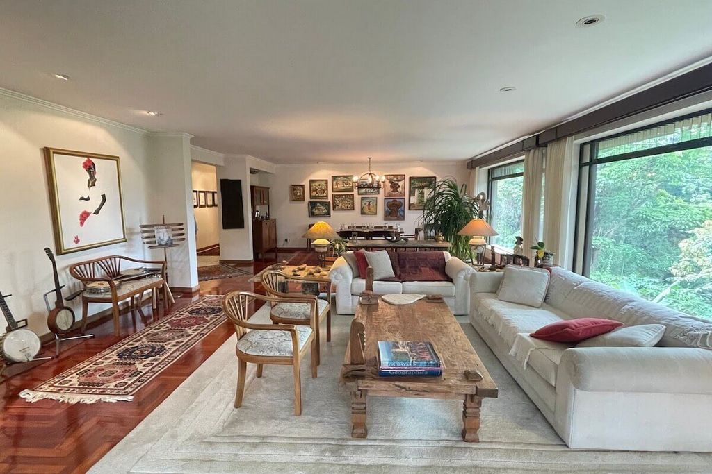 Property-RC1325 Beautiful Single Story Apartment in the Exclusive Condominium Del Rio, Escazú. A single floor. 3rd floor. Double living room, dining room, integrated terrace, 1/2 guest bathroom, large kitchen with breakfast bar, pantry, laundry room, maid's room with full bathroom, wine cellar, garage for 2 cars. 3 bedrooms (the main one with walk in closet, bathroom with shower and jacuzzi), 2 bathrooms (2 secondary bedrooms share 1 bathroom) and TV room. Luxury finishes: wooden floors in the living room, large spaces, environment of a lot of nature with beautiful trees and the sound of the river. Maintenance fee: ₡500,000 Year of construction: 1995 4 units in the condominium. 264 m² of living space + 30 m² of assigned parking.
