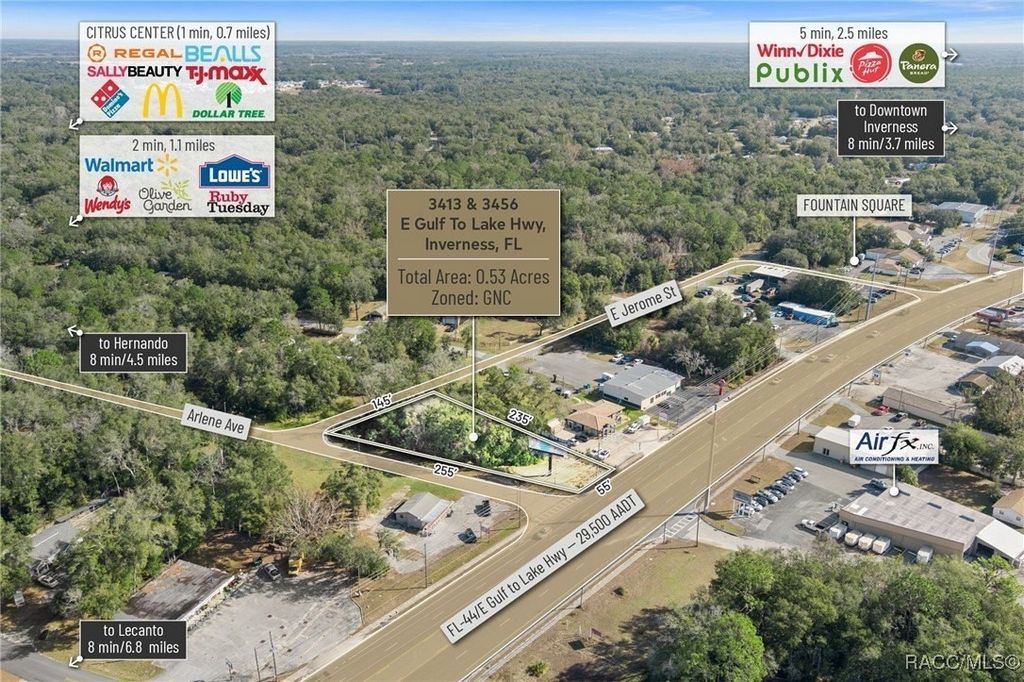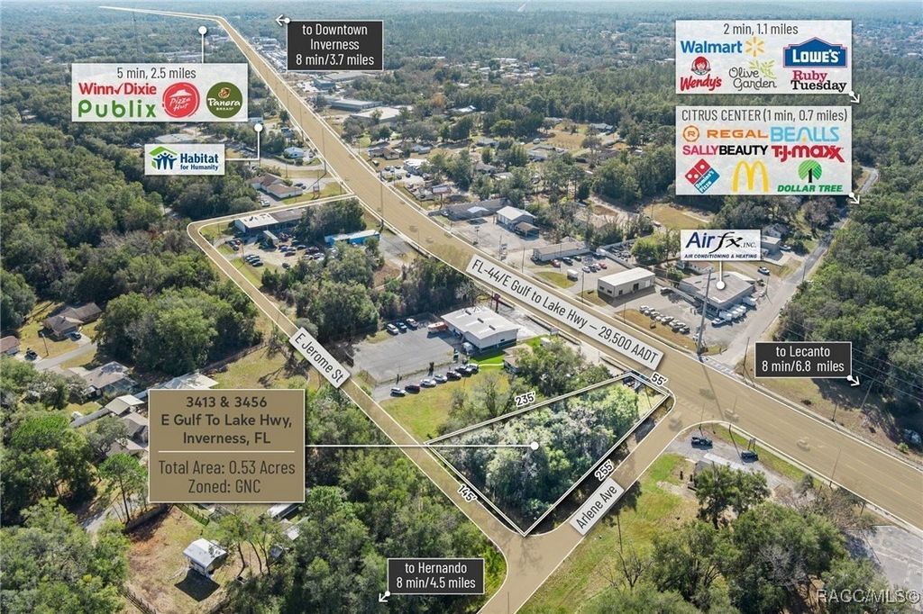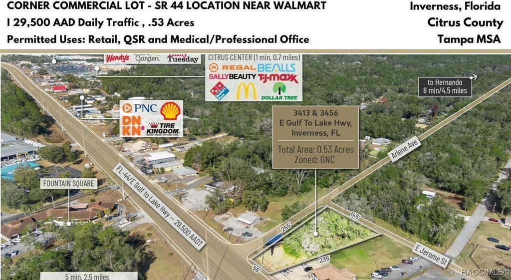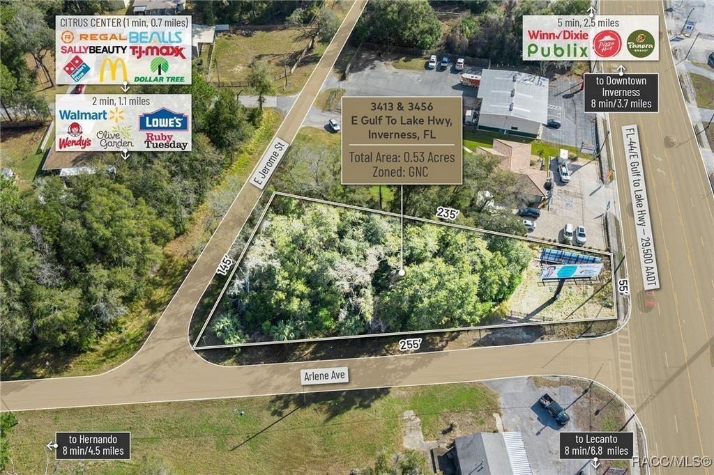 Located within the SR 44 Commercial Corridor in Citrus County, this 0.53-acre General Commercial property offers 55 feet of highway frontage, access to public water, and a future sewer connection. Positioned at the northeast corner of SR 44 and S Arlene Ave, it sits just 3.5 miles east of Downtown Inverness, home to major county offices and Citrus Memorial Hospital. With 1.3 miles of proximity to national retailers such as Walmart, Lowe's, TJ Maxx, and Regal Cinema, as well as multiple quick-service restaurants and financial institutions, this site offers excellent commercial potential. Its General Commercial zoning permits up to 70% site utilization, making it ideal for retail, medical offices, or professional spaces. The Inverness area supports 32,510 residents, while Citrus County's population exceeds 155,000. Growth is accelerating with the Suncoast Parkway Extension, providing quick access to Tampa International Airport and surrounding counties. As part of one of the largest MSAs in the country, this market remains affordable yet primed for expansion, with 60,000 vacant parcels, ongoing infrastructure investment, and zoning to accommodate future growth to 350,000 residents. This is a rare opportunity to invest in a high-growth region with natural preserves, waterways, an active adult community, and a favorable tax base. Secure your place in the Gem of the Florida Nature Coast today! Disclaimer: All information provided herein is for marketing purposes only and is not guaranteed for accuracy. Prospective buyers or tenants are encouraged to conduct their own independent due diligence. The seller, broker, and associated parties make no representations or warranties, expressed or implied, as to the accuracy or completeness of this information. All dimensions, zoning details, financial data, and other property-related facts should be independently verified. Please consult with appropriate licensed professionals before making any investment or purchasing decisions.