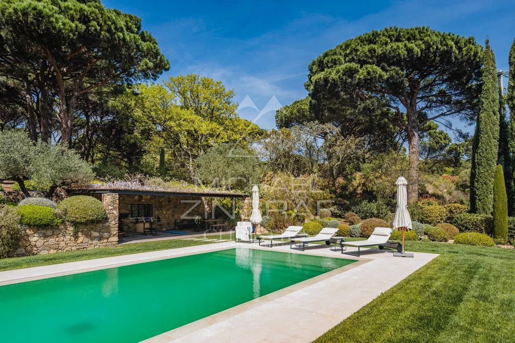 - Parking In der Nähe des Zentrums von Saint-Tropez und den Stränden von Pampelonne besteht dieses prächtige, komplett renovierte Anwesen aus einem 5 400 m² großen Landschaftsgarten und einem einstöckigen Haus, das in einem erstaunlichen zeitgenössischen provenzalischen Stil gestaltet ist. Kein Vis-à-vis, absolute Ruhe. 15 Meter Spiegelpool.