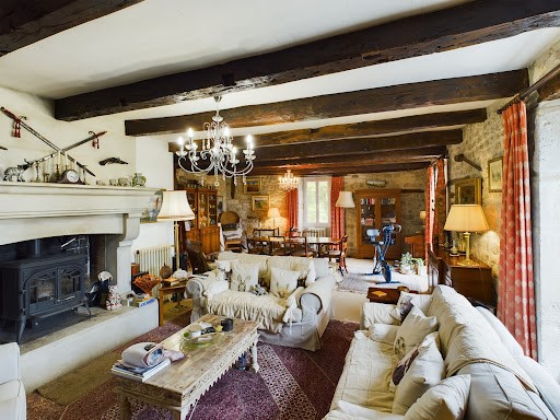 La maison principale bénéficie de fenêtres en double vitrage et d'un système de chauffage central (pompe à chaleur); elle possède des murs en pierres apparentes et des plafonds à poutres apparentes, ainsi qu'un four à pain d'origine dans la cuisine et une ancienne et rare fontaine profonde en pierre (utilisé pour laver le linge à l'époque !) Il y a une belle cheminée en pierre avec un poêle à bois efficace dans la salle de séjour. Au sous-sol, 3 pièces séparées en pierre (63m2) abritent la chaufferie, la buanderie, les rangements et une cave à vin verrouillable avec une bonne hauteur de chute et uniquement accessible de l'extérieur.