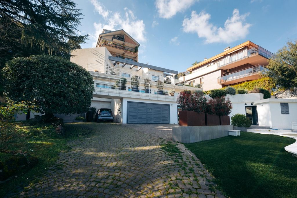 Dess arkitektoniska stil, inspirerad av amerikanska bostäder, utmärker sig för sina stora terrasser fördelade på flera nivåer, på totalt 410 kvadratmeter, och för den fantastiska privata poolen. Den dominerande vita färgen ger en modern touch, medan den raffinerade designen och de slingrande linjerna skapar en välkomnande och raffinerad atmosfär. På bottenvåningen vetter ett majestätiskt mottagningsrum med öppen spis mot matsalen, ansluten till ett fullt möblerat kök. På samma nivå finns en vacker terrass, ett gästrum med eget badrum, ett andra badrum, ett kontorsområde och en oberoende servicelägenhet med tvättstuga, strykrum, sovrum och badrum. På första våningen finns två stora sovrum, båda utrustade med klädkammare, tillsammans med två eleganta badrum. Det finns också ett tredje rum, som för närvarande används som en rymlig klädkammare. Alla rum har tillgång till en takterrass. Poolgolvet (källaren) är helt tillägnat avkoppling och välbefinnande, med ett fullt utrustat gym, två badrum, ett hobbyrum, en tvättstuga, ett rum inrättat för installation av ett turkiskt bad och källare. Nivån kompletteras av ett stort garage på 47 kvadratmeter, utrustat med en laddstation (wallbox) och tillgängligt via en automatisk upp-och-över-dörr. Den 1500 kvadratmeter stora parken, med uppmärksamhet på de minsta detaljerna, är utsmyckad med ett suggestivt belysningssystem och en pool med automatiserad rening genom artificiell intelligens. Ytterligare källare och tekniska rum finns i källaren.