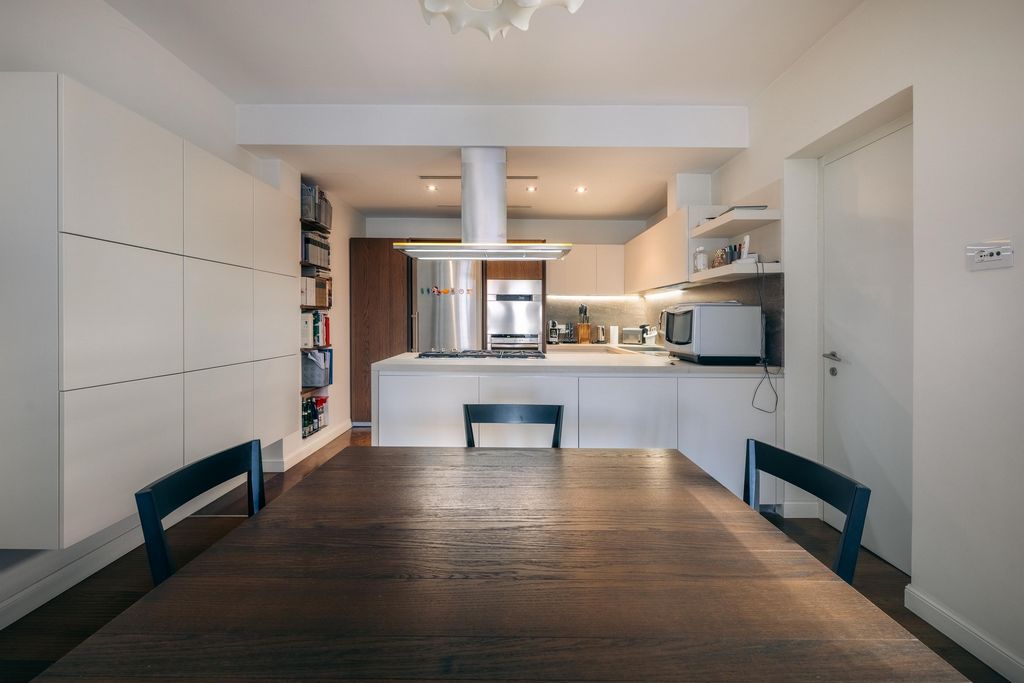De bouwstijl, geïnspireerd op Amerikaanse woningen, valt op door zijn grote terrassen verspreid over verschillende niveaus, voor een totaal van 410 vierkante meter, en door het prachtige privézwembad. Het dominante wit geeft een modern tintje, terwijl het verfijnde design en de golvende lijnen een gastvrije en verfijnde sfeer creëren. Op de begane grond komt een majestueuze ontvangstruimte met open haard uit op de eetkamer, verbonden met een volledig ingerichte keuken. Op hetzelfde niveau is er een prachtig terras, een logeerkamer met en-suite badkamer, een tweede badkamer, een kantoorruimte en een onafhankelijk serviceappartement met wasruimte, strijkkamer, slaapkamer en badkamer. Op de eerste verdieping bevinden zich twee grote slaapkamers, beide voorzien van inloopkasten, vergezeld van twee elegante badkamers. Tevens is er een derde kamer, thans in gebruik als ruime inloopkast. Alle kamers hebben toegang tot een dakterras. De bodem van het zwembad (kelder) is volledig gewijd aan ontspanning en welzijn, met een volledig uitgeruste fitnessruimte, twee badkamers, een hobbyruimte, een wasruimte, een ruimte die is ingericht voor de installatie van een Turks bad en kelders. Het niveau wordt gecompleteerd door een grote garage van 47 vierkante meter, voorzien van een laadstation (wallbox) en toegankelijk via een automatische kanteldeur. Het park van 1500 vierkante meter, met aandacht voor de kleinste details, is verfraaid met een suggestief verlichtingssysteem en een zwembad met geautomatiseerde zuivering door middel van kunstmatige intelligentie. In het souterrain bevinden zich extra kelder en technische ruimtes.