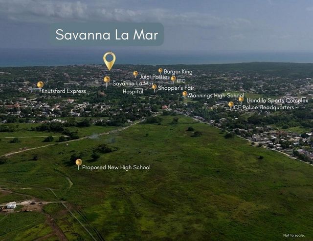 Dit landgoed van 38,4 hectare in Bath Pen, Savanna-la-Mar, Westmoreland, is ideaal gelegen voor groei. Belangrijke projecten in de buurt zijn onder meer een volledig goedgekeurde internationale luchthaven in Little London, een voorgestelde middelbare school, een nieuw hoofdkwartier van de politieafdeling en een groot NHT-huisvestingsplan naast het perceel, wat de waarde op lange termijn verhoogt. Het nabijgelegen Paradise Solar Park, het grootste van Jamaica, levert schone, goedkope energie aan het net, in lijn met de nationale infrastructuurdoelstellingen. Het perceel ligt op enkele minuten van Savanna-la-Mar en heeft water en elektriciteit, waardoor het ideaal is voor residentiële, commerciële of gemengde ontwikkeling. Belangrijke voorzieningen zoals fastfoodketens, Knutsford Express, Mannings High, het ziekenhuis, Jamaica National Bank, belastingkantoor en Victoria Mutual Building Society liggen op minder dan 5 minuten afstand. Negril's Seven Mile Beach en Rick's Cafe liggen ook op een klein eindje rijden. Deze locatie is geschikt voor woongemeenschappen, eco-resorts, commerciële pleinen, scholen, agri-business of wellness-ontwikkelingen. Een zeldzame investering in een van de snelst groeiende regio's van Jamaica.