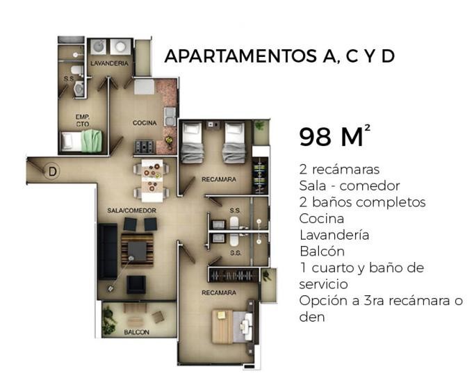 Amplio apartamento de 2 habitaciones con 2 baños + Cuarto y baño de servicio
